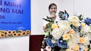 Cô Phạm Thị Ánh – Phó hiệu trưởng nhà trường lên phát biểu chúc mừng ra mắt BCH Đoàn trường THPT Hoàng Mai nhiệm kỳ 2025-2026
