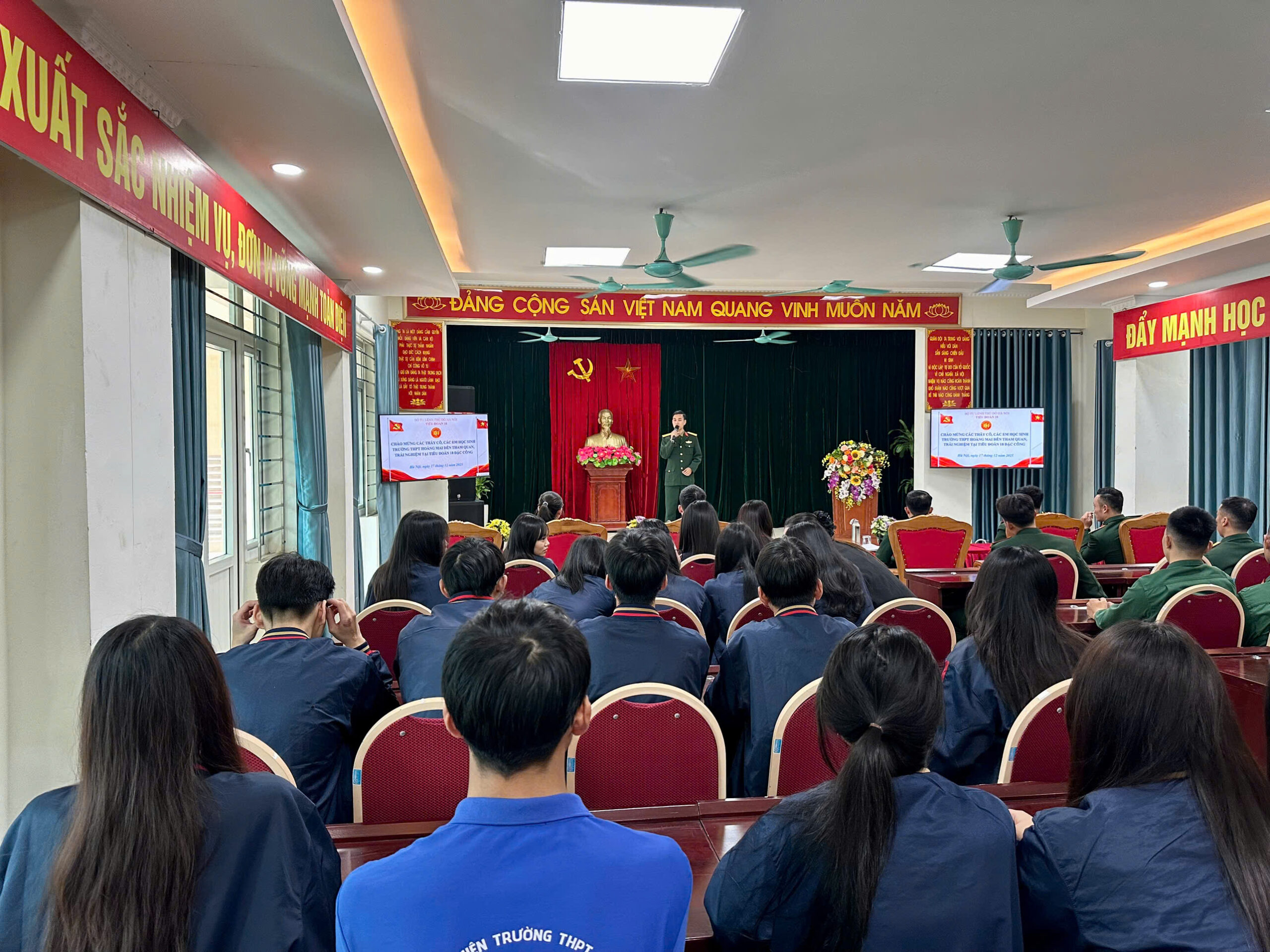 Hướng tới Kỷ niệm 81 năm Ngày thành lập Quân đội Nhân dân Việt Nam (22/12/1944 – 22/12/2025), Đoàn trường THPT Hoàng Mai đã tổ chức hoạt động tham quan, giao lưu và tìm hiểu thực tế tại Tiểu đoàn 18 Đặc công – Bộ Tư lệnh Thủ đô Hà Nội dành cho các đoàn viên, thanh niên ưu tú của nhà trường.